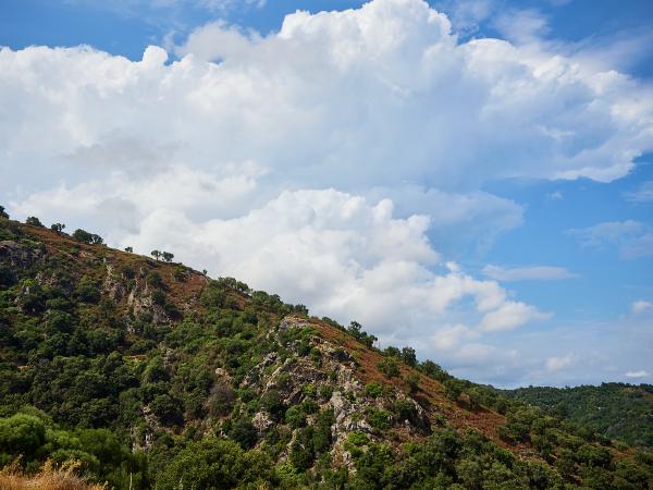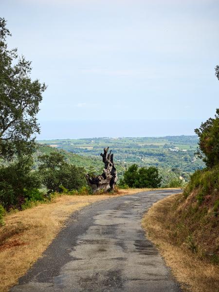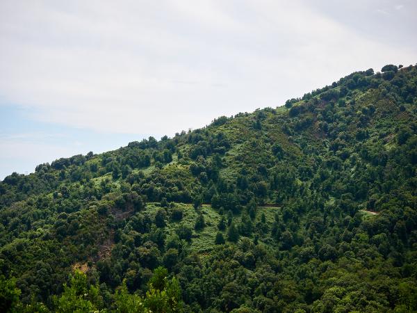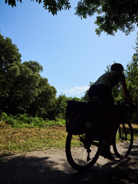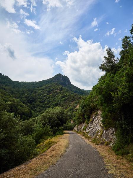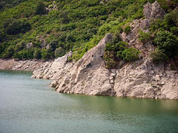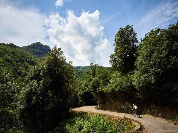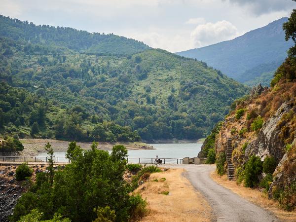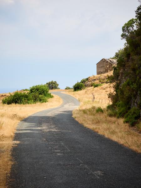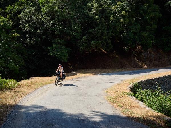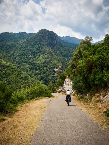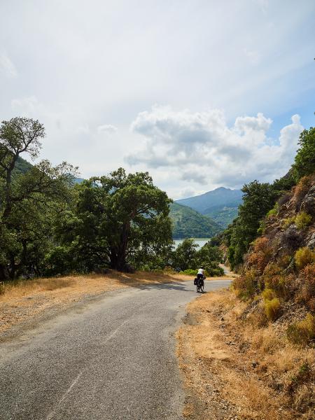 Tag Nummer Siebenundachzig von Pruno nach Aléria. Nachdem wir uns im nächsten Ort versorgt hatten ging es wieder in die Hügel. über etwas über 1 Auto breite Straßen, die dann doch noch einen Mittelstreifen haben. Auch interessant. Aber auch im ersten Anstieg waren die Steigungen noch ganz angenehm, wenn auch bisschen steiler. Aber sehr ruhig. Weiter oben dann konnten wir Ausblicke und eine rollende Strecke genießen. Dann um die Mittagszeit haben wir unsere sehr französische Mittagspause mit Baguette und Camembert zu uns genommen um uns für die restliche Strecke zu stärken. Auch hier wieder sehr viele Brunnen an der Strecke, was ob der schwülen Hitze sehr gut war. Nachdem wir so einige schöne Plätze abgefahren waren (mal sattgrün, dann wieder goldbraun) ging es erst zum Alesani-Stausee und von dort die erste etwas unangenehmere Steigung bergauf. Alles noch machbar, aber der Beweis, dass auch hier mal eine Straße im zweistelligen Prozentbereich sein kann. Danach ging es wieder flott bergauf und bergab, bis wir zwischendurch zu unserem Komoot-special für den Tag gelangten, einen ausgewaschenen, steilen (bergauf und bergab), überwucherten Weg, der und einige Kraft und Nerven kostete. Nachdem wir den Weg absolviert hatten wurden wir aber von einer fantastischen Abfahrt belohnt und konnten danach bei gemütlich abfallender Straße bis Aléria Gas geben.